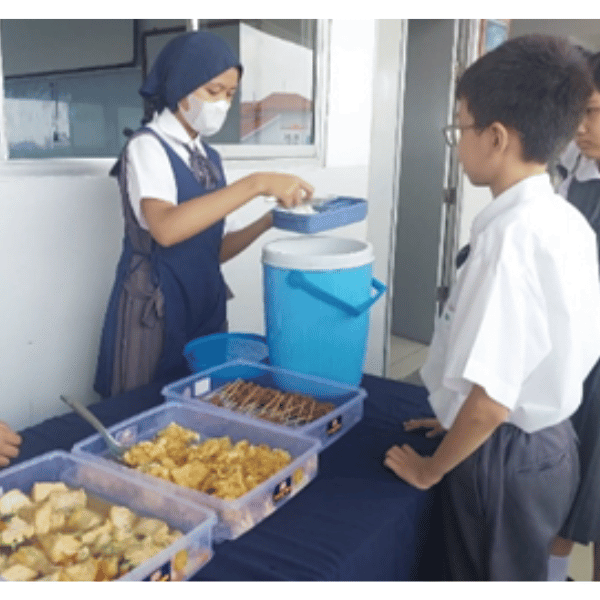 Setelah mendengarkan ceramah Master, siswa-siswi mulai berbaris dan bersiap mengantre makanan dengan tertib dan rapi. Setelah semuanya selesai mengantre, mereka menyanyikan lagu “Gan En Ge”. Setelah itu, dilanjutkan dengan berdoa sesuai dengan keyakinannya masing-masing, dan anak-anak memulai menyantap makanan dengan penuh rasa syukur. Setelah siswa-siswi menyantap makanannya, kegiatan diakhiri dengan doa penutup.