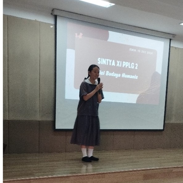 Contohnya, Sintya, seorang siswa kelas 11 PPLG2, mendapat giliran untuk melakukan public speaking pada hari Senin dengan tema “Empat Misi Tzu Chi,” yaitu misi amal, misi kesehatan, misi pendidikan, dan misi budaya kemanusiaan. Karena di sekolah diajarkan tentang budaya kemanusiaan atau budaya humanis (人文), Sintya memutuskan untuk memilih tema tersebut.