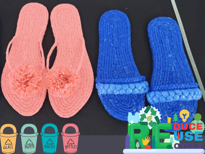 Kantong plastik, yang biasanya menjadi limbah yang tak bernilai, diubah menjadi sandal rumah yang sangat bermanfaat karena beralih fungsi. Bahan untuk membuat sandal rumah dari kantong plastik yaitu kantong plastik, kardus, gunting, dan lem tembak. Cara pembuatannya mudah, yaitu kardus dicetak sesuai ukuran kaki, kantong plastik disetrika yang sudah ditutupi kertas agar tidak terbakar, melapisi kardus dengan kantong plastik yang sudah disetrika sebelumnya, menggunting kantong plastik dengan bentuk persegi panjang, kepang guntingan plastik tersebut, dan rakit kepangan plastik tersebut di atas kardus yang sudah dilapisi plastik dan rekatkan dengan lem tembak.