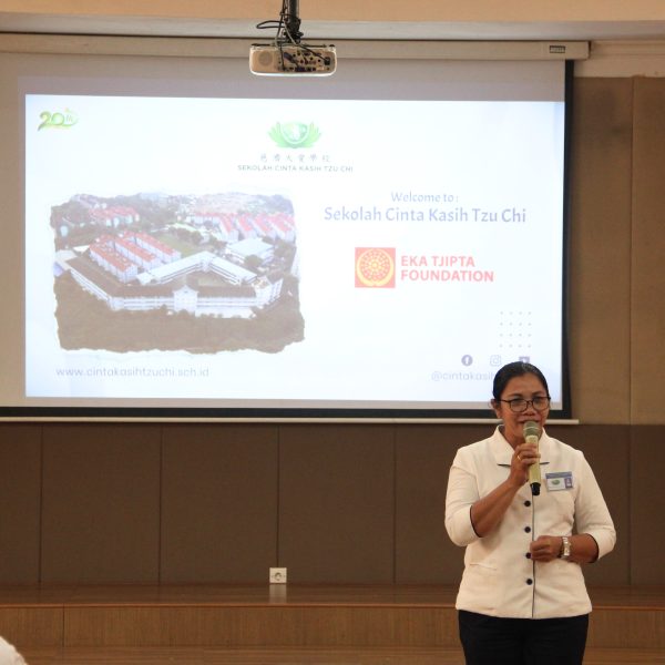Pak Edi Supeno memberikan penjelasan selama tour Sekolah Cinta Kasih Tzu Chi kepada para perwakilan Yayasan Eka Tjipta Foundation.