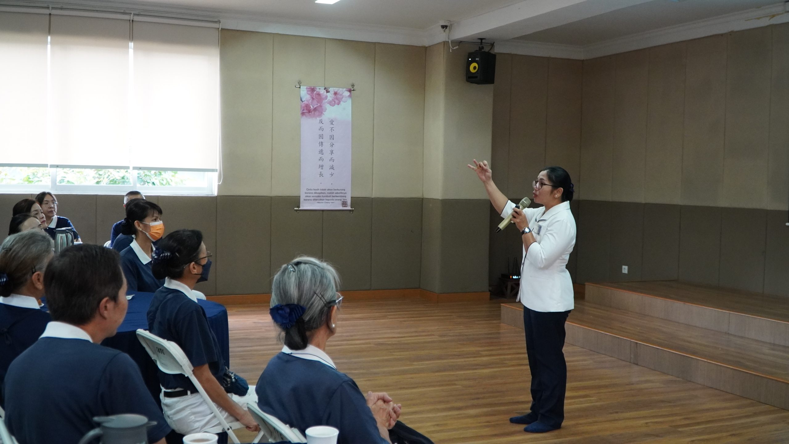 Shi Gu Maria merupkan relawan Tzu Chi pusat membantu menerjemahkan penjelasan materi yang sedang dibawakan.