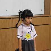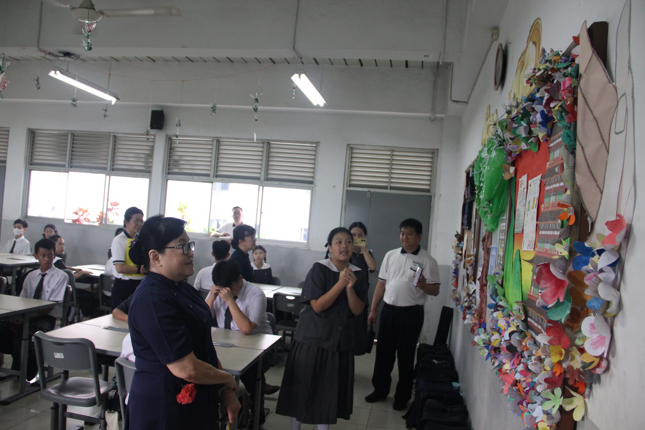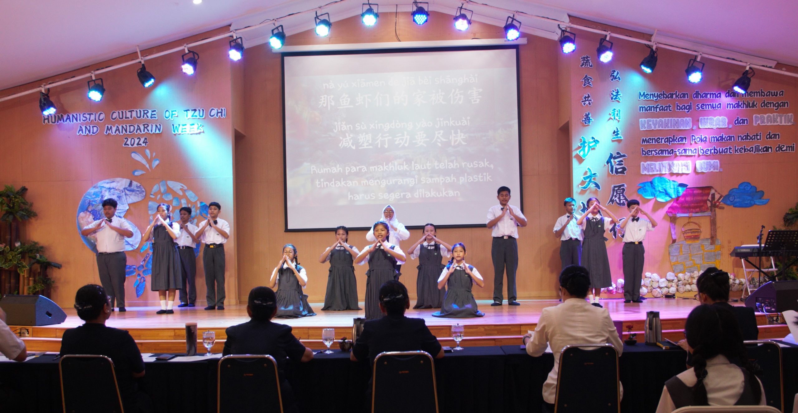 Tampak salah satu Murid Sekolah sedang menjelaskan makna arti dari pembuatan hiasan manding dengan tema yang telah di tentukan adalah 弘法利生信願行。蔬食共善護大地 Hóng fǎ lì shēng xìn yuàn xíng. Shū shí gòng shàn hù dà dì Menyebarkan Dharma dan Membawa Manfaat bagi Semua Mahkluk dengan keyakinan, ikrar dan praktik; Menerapkan Pola Makan Nabati dan Bersama-sama Berbuat Kebajikan demi Melindungi Bumi. Tema tersebut merupakan tema yang di tentukan oleh Master Cheng Yen. Tujuan dari tema tersebut adalah 1. Untuk memperkenalkan keanak-anak dalam tema tersebut tidaklah di pelajari juga mendalami makna setiap kata dalam tema tersebut.
