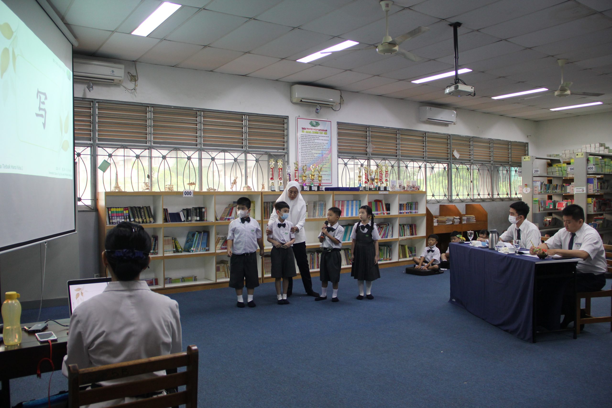 Anak-anak SD sedang menebak kata bahasa Mandarin