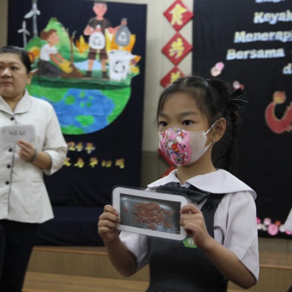 Anak-anak SD sedang menebak kata bahasa Mandarin