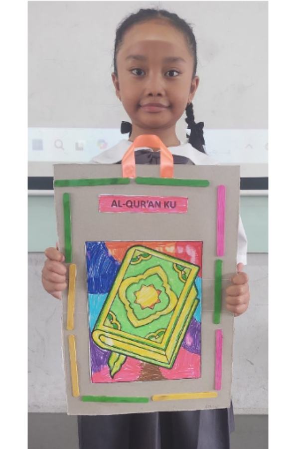Kamis, 12 Februari 2026, saya mengajak anak-anak kelas 1SD membuat project dari bahan sederhana untuk pembuatan frame Al-qur’an tersebut. Bahannya tidak susah dicari, mulai dari kardus bekas, stik es krim, gambar sketsa Al-Qur’an serta lem dan gunting serta pita untuk menggantungkan frame yang sudah jadi untuk dipajang di kelas ataupun di rumah masing-masing.